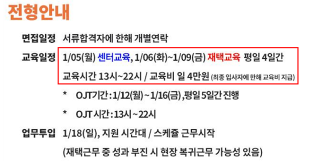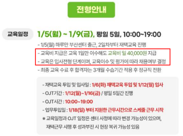 그 결과, 교육기간 동안 '교육생'이 된 노동자들은 최저임금에도 한참 못 미치는 하루 4만 원을 '교육비'라는 이름으로 지급받았다. 업체들은 이를 근로소득이 아닌 사업소득으로 신고했다. 2025년 12월 말에 채용 중이었던 쿠팡이츠 고객센터 채용공고를 보자.