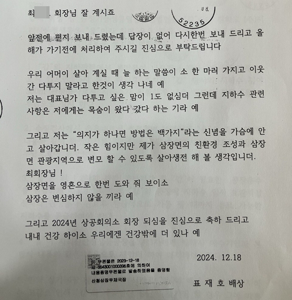 표 위원장은 경남도청에 분통을 터뜨렸다. 대책위는 증량을 막기 위해 할 수 있는 직접 행동은 다 했다. 2024년 2월부터 5월까지 삼장면 21개 마을을 돌아다니며 주민들의 반대 서명을 받았다. 전체 주민 1782명 중 1167명(65%)이 서명했다. 실거주자만 따지면 90%가 넘었다. 표 위원장은 "한 어른은 '내 아들이 생수공장 다니지만, 이건 아니다. 지하수는 지켜야지'라며 반대 서명을 해줬다"며 그때 분위기를 전했다.