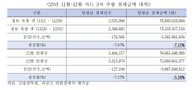 차규근 조국혁신당 의원이 15일 발표한 금융감독원을 통해 확보한 카드 3사의 11월부터 12 월 사이 쿠팡 결제 내역을 보면, 개인정보 유출 사태가 벌어진 11월 20일을 전후로 일 평균 매출이 7.11% 감소한 것으로 나타났다.