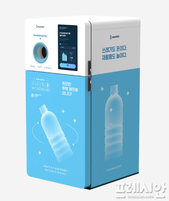 AI 투명 페트병 무인회수기는 가로 1m·세로 2m·폭 1m 크기로, ‘수퍼 빈’ 어플을 통해 회원가입 후 휴대전화 번호를 무인회수기 화면에 입력한 뒤 투입구에 투명 페트병을 넣으면 크기와 상관없이 개당 10포인트가 적립된다.