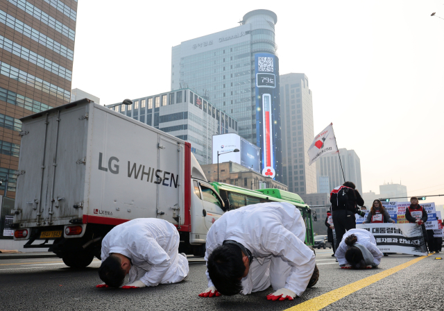 삼보일배는 세 번 걷고 한 번 절하는 행진 방식이다. 딱딱한 아스팔트에 무릎을 굽히는 동작을 반복하다 보니 보호대를 착용해도 온몸이 쑤신다. 근골격계가 연약한 고령 노동자들에게 너무 가혹한 투쟁이었다. 연대의 의미를 담아 기꺼이 삼보일배에 자원했다.