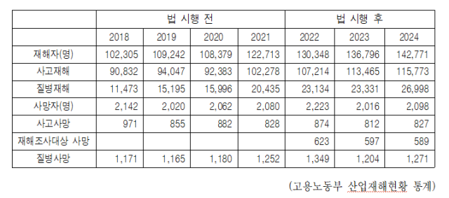 아울러 이들은 중대재해처벌법 시행 4년이 지나도록 대법원 양형위원회가 양형기준을 마련하지 않았다. 올해 1월에서야 양형기준 마련을 위한 심의에 들어간 상황"이라며 "중대재해처벌법의 양형기준이 부재한 상태에서 처벌 강화는 기대하기 어렵다"고 말했다.
