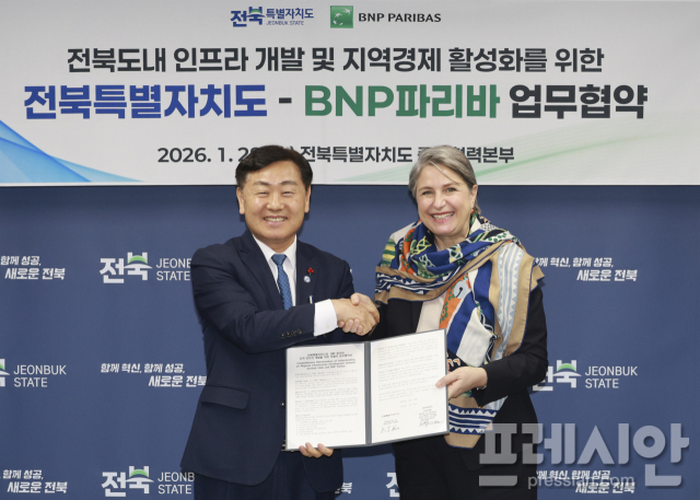 전북도는 28일 서울 중앙협력본부에서 BNP파리바와 도내 인프라 개발과 지역경제 활성화를 위한 업무협약(MOU)을 체결했다.