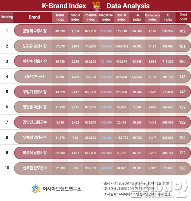 윤 시장은 앞서 지난 2025년 12월 발표된 K-브랜드 지수에서도 전라도 지자체장 부문 1위를 기록한 바 있다.