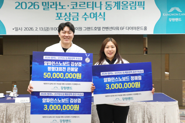 강원랜드(대표이사 직무대행 최철규)가 2026 동계 올림픽 국가대표로서 대한민국의 위상을 높인 김상겸, 정해림 선수의 값진 성과를 기념하고 대한민국 동계스포츠 발전에 기여한 공로를 함께 축하하기 위한 자리를 마련했다고 13일 밝혔다.