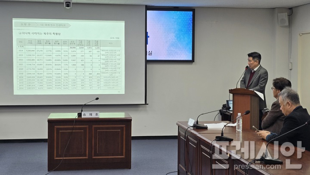 회복과 성장을 위한 제주혁신포럼은 23일 오전 제주도의회 소회의실에서 '제주 민선 8기 재정 운용 진단' 간담회 개최했다. 주제 발제에 나선 백상규 전 제주도의회 예산결산특별위원회 전문위원은 임기 막바지에 이른 오영훈 도정의 재정 운영 실태를 '방만' '방심' '방관' 세 가지 키워드로 압축해 분석했다.