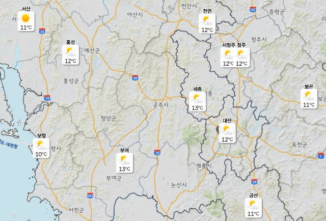 이날 낮 최고기온은 대전 11도, 세종 13도, 청주·천안 12도로 예보됐으며 아침 최저기온은 1도로 13도 안팎의 기온차가 나타날 전망이다.