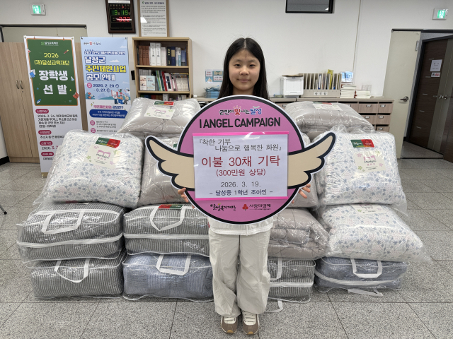 대구 달성중학교 1학년 조아인 양이 최근 자신이 선행으로 받은 장학금과 그 동안 모아 둔 용돈으로, 관내 저소득 가구에 이불 30채를 기부함으로써 대견하다는 평이 잇따르고 있다.