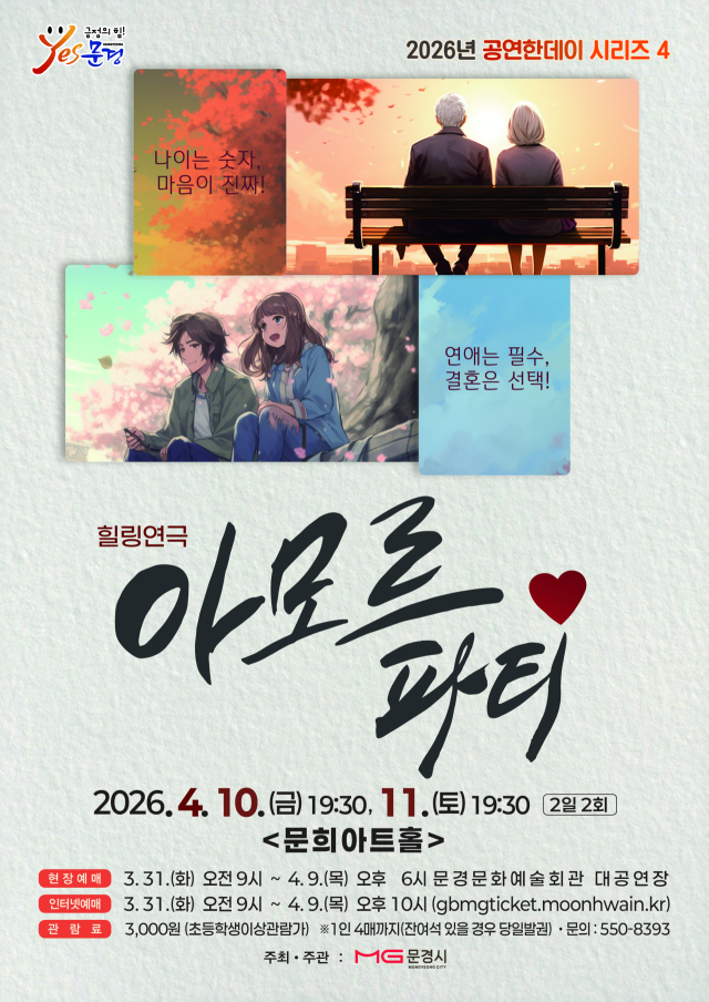 경북 문경문화예술회관에서는 누구나 한번쯤 겪는 순수한 사랑 이야기를 담은 연극 아모르파티 공연을 4월 10일 19:30, 11일 19:30 2회에 걸쳐 문희아트홀에서 개최한다.