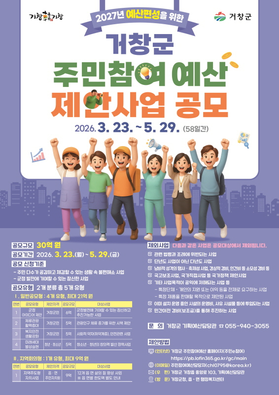 경남 거창군은 23일부터 5월 29일까지 예산 편성 과정에 주민의 의견을 실질적으로 반영하고 지역에 필요한 사업을 직접 제안할 수 있는 ‘2027년 주민참여예산 제안사업 공모’를 추진한다고 밝혔다.