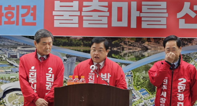 경남 진주시장 선거에 출마하는 국민의힘 예비후보 김권수·박명균·한경호 세 후보가 조규일 시장의 3선 도전에 대해 "사법적 리스크를 안고 강행하는 것은 부적절하다"며 불출마 선언을 강력히 촉구하고 나섰다.