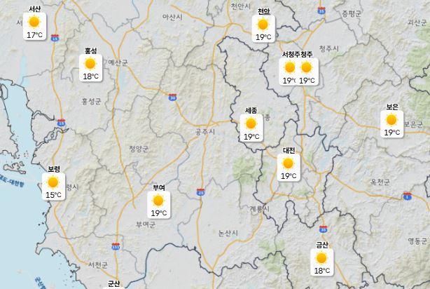 이날 낮 최고기온은 대전 18도, 세종·청주·천안 19도로 예보됐으며 아침 최저기온은 6도로 비교적 온화한 수준을 유지할 전망이다.