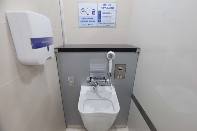 삼성창원병원의 장루·요루 전용 화장실은 선 자세에서도 주머니를 쉽게 비울 수 있고, 세척이 용이하다는 특징이다.