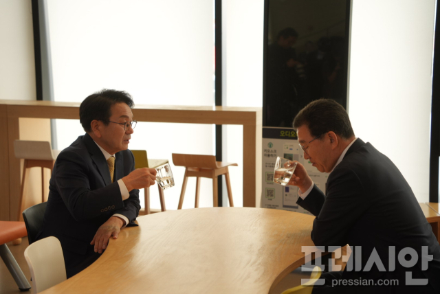 이들은 입구 인근 탁자에 앉아 담소를 나눈 뒤 2층에서 기자들과 만나 단일화를 선언했다.
