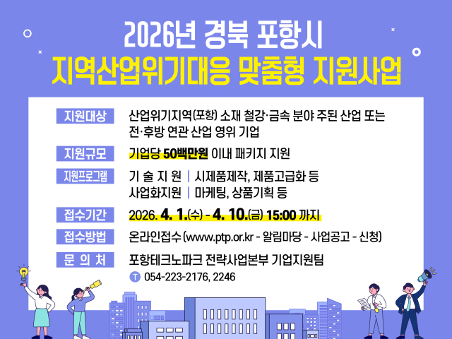 포항TP는 ‘2026년 지역산업위기대응 맞춤형 지원사업’ 참여기업을 오는 10일까지 모집한다고 1일 밝혔다.