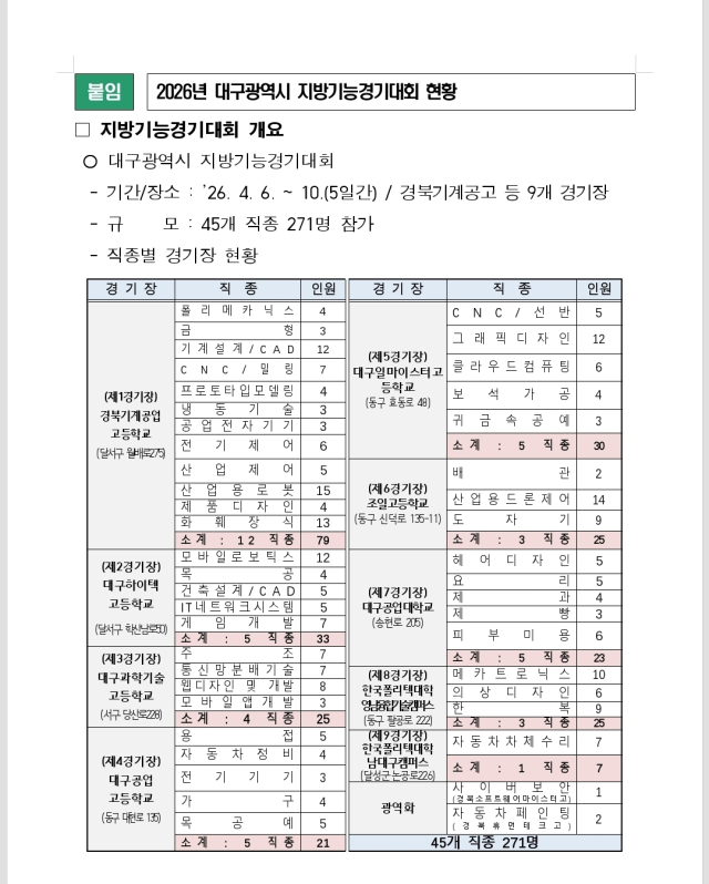지역 숙련기술인들의 축제인 ‘2026년도 대구광역시 기능경기대회’가 오는 6일부터 10일까지 5일간 경북기계공업고등학교 등 9개 경기장에서 개최된다.