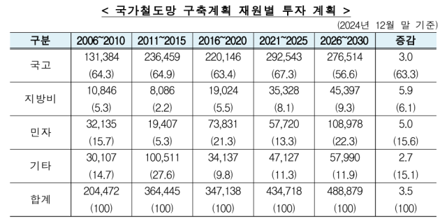 현재 민자철도는 인천공항철도, 신분당선, GTX-A 등 9개 사업이 개통해 운영 중이며, 부전-마산선, 신안산선 등의 2개 구간은 건설 단계에 있다. GTX-B와 C 등의 4개 노선은 착공 준비 중이며 총 15개 사업이 진행되고 있다. 민자철도 노선이 계속 확대되고 있는데 따라 관련 투자액도 대폭 늘어나고 있다. 국토교통부의 '국가철도망 구축계획에 따른 재원별 투자 계획'을 보면 민자투자 비중이 2011년~2015년에는 전체 재원의 5.3%에 불과했다. 하지만 이후 지속적으로 확대돼 2026~2030년에는 전체 대비 22.3%인 10조 8978억 원으로 역대 최고치로 늘었다.