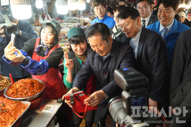 정 대표는 상인들의 손을 일일이 맞잡고 셀카 요청에 응하며 "1박 2일 일정인지 몰랐다"며 시장 한 속옷 매장에서 속옷와 와이셔츠, 양말 등 4만 원어치를 구매하는 소탈한 모습을 보였다.
