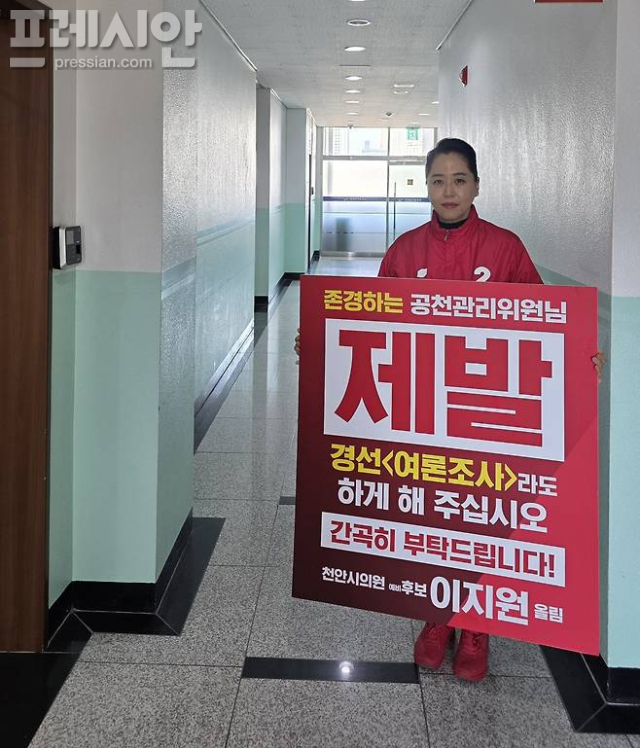 이지원 예비후보는 도당 앞에서 1인 시위를 벌이며 경선 실시를 촉구했다.