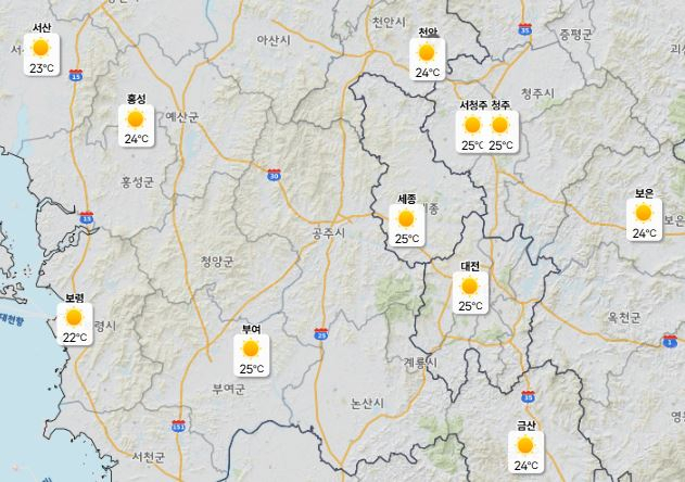 이날 낮 최고기온은 대전·천안 24도, 세종·청주 25도까지 오르겠으며 아침 최저기온은 9도로 예보됐다.