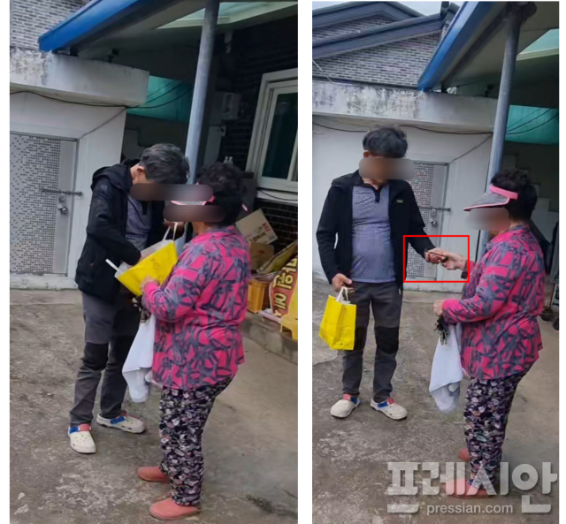 제보된 영상에는 마을 이장이 수십 대의 휴대전화를 담은 노란색 쇼핑봉투를 들고 다니며 휴대전화를 돌려주는 모습이 담겨있다.