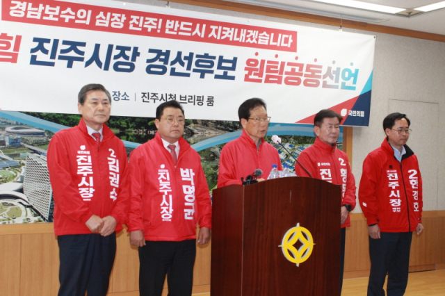 국민의힘 진주시장 경선에 출마한 강갑중·김권수·박명균·한경호·황동간 다섯 명의 후보는 16일 공동 기자회견을 열고 '완전한 원팀 경선'을 공식 선언했다.