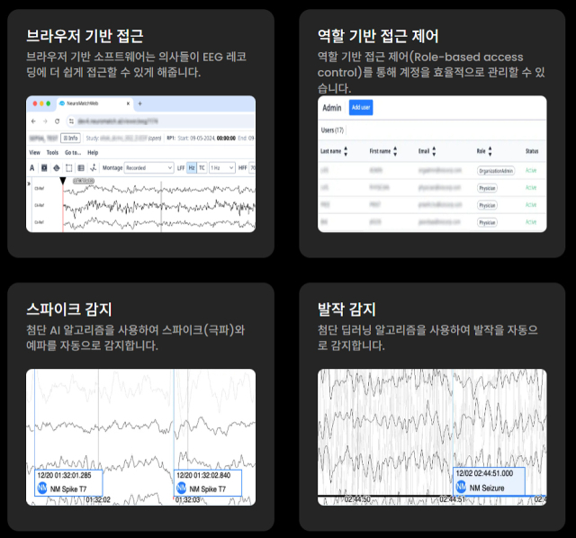 ‘뉴로매치(NeuroMatch)’는 뇌파(EEG) 판독 지원용 클라우드 기반 AI 의료 소프트웨어 플랫폼으로, 뇌파 검토 과정을 자동화하고 판독을 방해하는 오류를 제거하며, 스파이크와 발작을 탐지해 기존 수시간이 소요되던 해석 시간을 수분 단위로 단축함으로써 의료진의 신속하고 정확한 진단을 지원하는 것이 특징이다.
