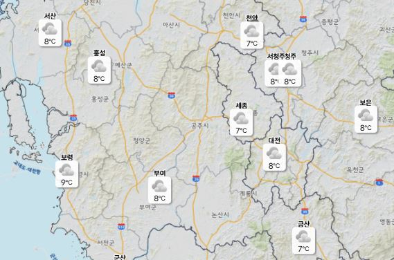 이날 낮 최고기온은 대전·천안 22도, 세종·청주 23도로 예보됐으며 아침 최저기온은 7도 수준에 머물며 최대 16도의 큰 기온차가 예상된다.