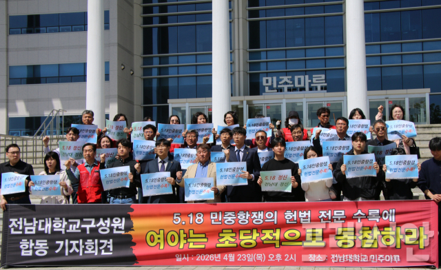전남대 구성원 단체들은 23일 오후 교내 민주마루 앞에서 공동 기자회견을 열고 "5·18민중항쟁의 헌법 전문 수록에 여야는 초당적으로 동참하라"면서 "오는 6월 지방선거와 연계한 개헌 국민투표가 이뤄지기 위해서는 여야의 정치적 결단이 시급하다"고 강조했다.