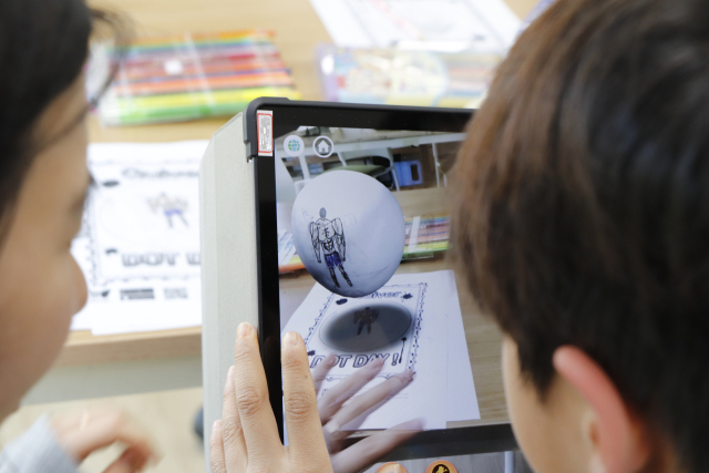 아이들은 평면에 그려진 로봇, 토끼, 비행기 등 다양한 캐릭터를 저마다의 색깔로 정성껏 색칠한 뒤, 태블릿 PC를 통해 자신이 그린 그림이 화면 속에서 튀어나와 살아 움직이는 모습을 체험했다.