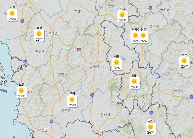 이날 낮 최고기온은 대전·세종·청주·천안 모두 26도로 예보됐고 아침 최저기온은 5도 수준에 머물며 최대 21도의 큰 기온차가 예상된다.