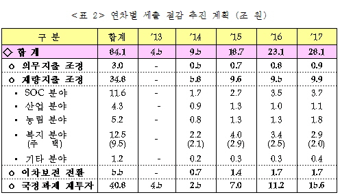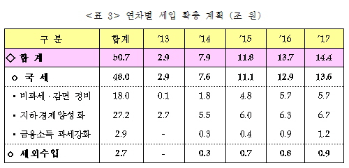 | ▲ 출처: 기획재정부, "박근혜 정부 국정 과제 이행을 위한 재정 지원 실천 계획 '공약가계부' 발표" (2013. 5. 31) |