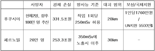 가장 눈길을 끄는 것은 인명 피해. 폭발 및 방사능 관련 질환으로 사망한 피해자들의 수는 체르노빌의 경우 사고 후 25년간 20만 명에 달했다. 그러나 크리스 버스비 영국 얼스터대 교수는 후쿠시마 사태의 여파로 앞으로 100만 명 이상이 사망할 것이라고 주장했다.