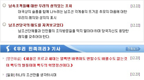 '남측 조객들에 대한 우리의 성의있는 조치' 제하의 기사에서 이 사이트는 "우리의 해당 기관들에서는 조의방문을 희망하는 남조선의 모든 조의 대표단과 조문 사절들을 동포애의 정으로 정중히 받아들이며 개성육로와 항공로를 열어놓는 조치를 취하였다"고 밝혔다.