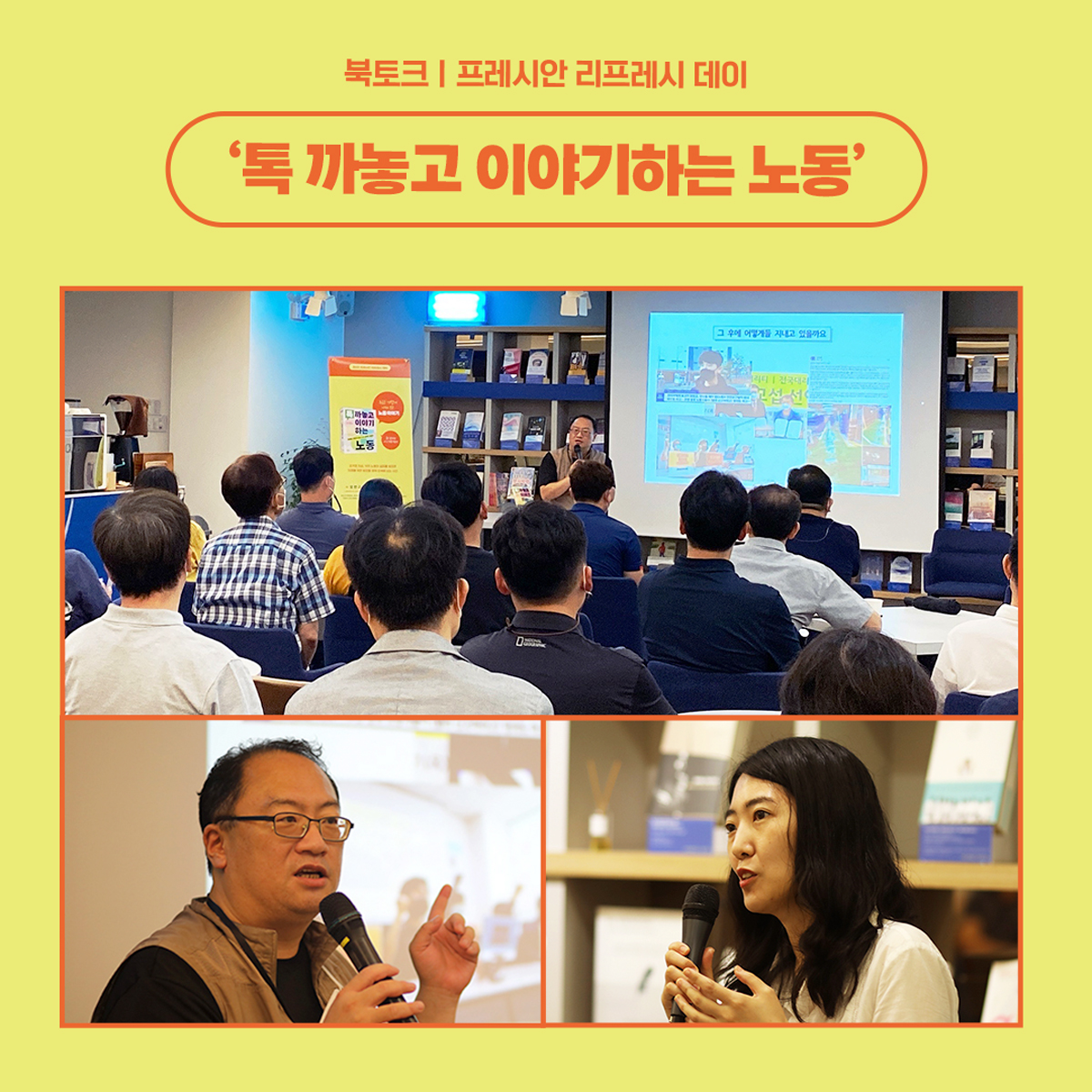 우리 시대 '일자리'에 대한 고민을 담은 책 <톡 까놓고 이야기하는 노동>의 저자들이 <프레시안>과 만났어요. <프레시안>은 지난달 29일 서울 합정동 디어 라이프에서 <톡 까놓고 이야기하는 노동> 오프라인 북토크를 개최했습니다. 이날 북토크엔 노동자들과의 대담을 진행하고 그 이야기를 책으로 엮은 오민규 노동문제연구소 해방 연구실장과 안진이 더불어삶 대표가 저자 대표로 참여했는데요. 두 사람은 플랫폼 노동, 미래차 산업 등이 상징하는 노동 전환기 시대에 맞춰 우리 사회가 '좋은 일자리에 대한 감각'을 길러나가야 한다고 입을 모았어요. 자세한 이야기는 기사를 클릭해 주세요!