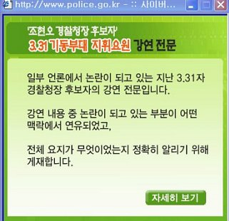 고(故) 노무현 전 대통령과 천안함 유족, 촛불 집회 등에 대한 조현오 경찰청장 내정자의 '막말 파문'과 관련, 경찰청이 문제가 된 발언이 나온 특강의 전문(全文)을 17일 경찰청 누리집에 공개했다.