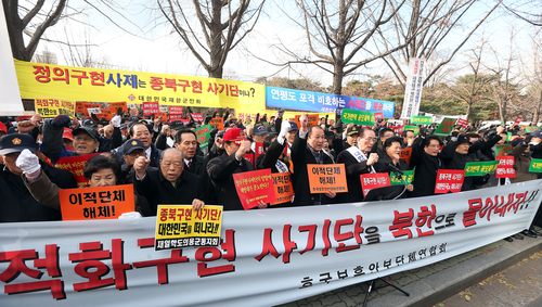 | ▲ 서울 송파구에 위치한 천주교 정의구현사제단 사무실 앞에 모인 대한민국재향군인회와 호국보훈안보단체연합회 소속 회원들이 지난 22일 시국미사에서 연평도 포격과 천안함 사건에 대한 소신을 밝힌 천주교 정의구현사제단 전주교구 신부를 규탄하는 집회를 열고 있다. 2013.11.26 ⓒ연합뉴스 |