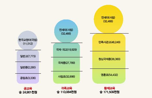 이를 종합해보면, 자녀가 공립초등학교, 일반중학교, 일반고등학교, 한국교원대를 거칠 경우 16년 간 학비는 총 2490만 원이다. 반면 사립초등학교, 국제중학교, 외국어고등학교, 연세대의 코스를 보낼 경우 학비는 1억1308만 원이나 된다.