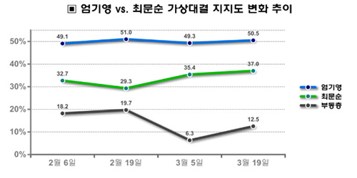 엄 예비후보는 여전히 높은 인지도를 바탕으로 50% 이상 지지율을 구가하고 있고, 최 예비후보는 30% 초반 대에서 30% 후반 대로 올라가는 추세를 보이고 있다.