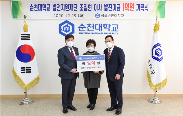 이에 고영진 순천대 총장은 “코로나19로 인해 모두가 어려운 시기에 우리 학교에 큰 애정과 관심을 보여주신 데 감사드리며 기부금은 이사님의 뜻을 받들어 학교의 발전과 학생들의 학업정진을 위해 소중히 사용하겠다. 우리 순천대학교가 전남 동부권의 중심 학교로 거듭나고 의대 유치를 통해 더욱 발전해 나갈 수 있도록 힘쓰겠다”고 말했다.