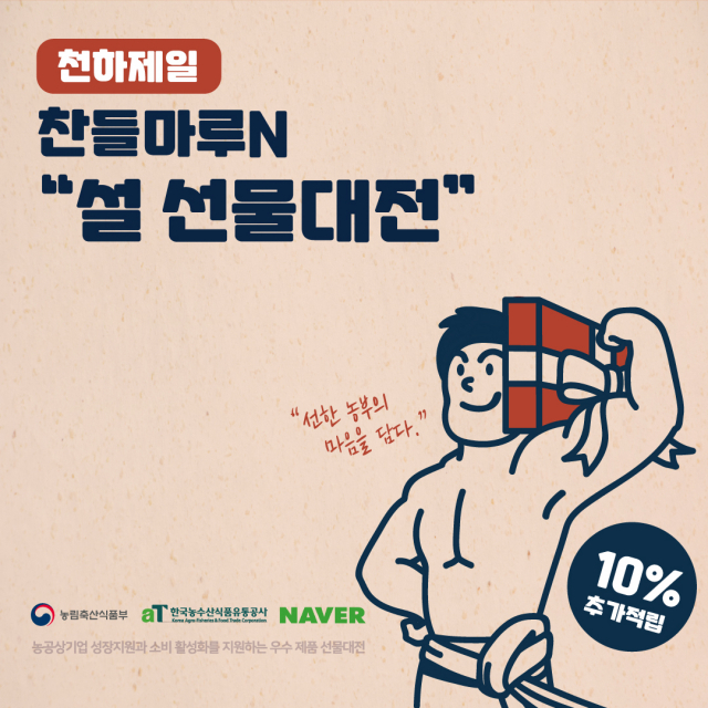 또한 농공상기업의 온라인 판로를 위한 자생력을 키워주기 위해 ‘찬들마루N’ 입점기업 중 성장가능성이 높은 30개사에 대해서는 300만 원 한도 내 네이버 광고 및 마케팅 컨설팅도 지원한다.