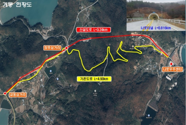본 노선은 봉래면 교동에서 나로우주센터까지 구불구불한 고갯길인 위험도로 구간을 터널로 개설해 선형 개량한 도로로서 운행거리가 4.9km에서 3.24km로 약 1.66km가 단축되고 통행시간은 8분에서 3분으로 5분이 단축된다.