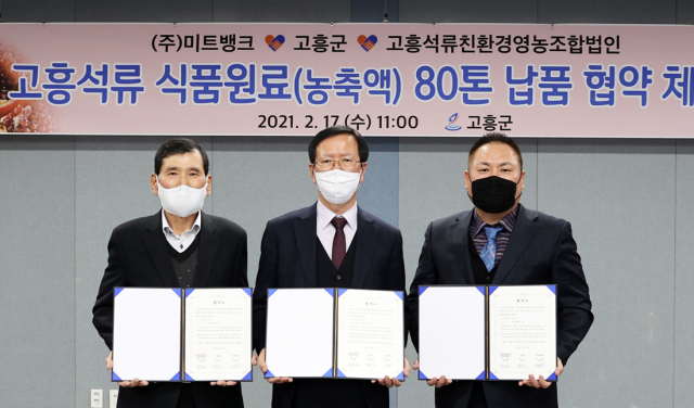 고흥군(군수 송귀근)과 주식회사 미트뱅크(대표 김영준), 고흥석류친환경영농조합법인(대표 손용해)이 함께 손을 잡고 고흥석류의 판로확대를 위해 함께 하기로 했다.