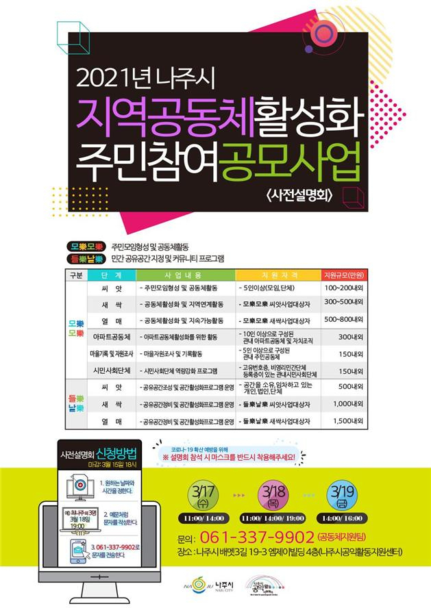 공모사업 및 사전 설명회에 관한 세부사항은 나주시·나주시공익활동지원센터 누리집 고시공고란에서 확인할 수 있다.