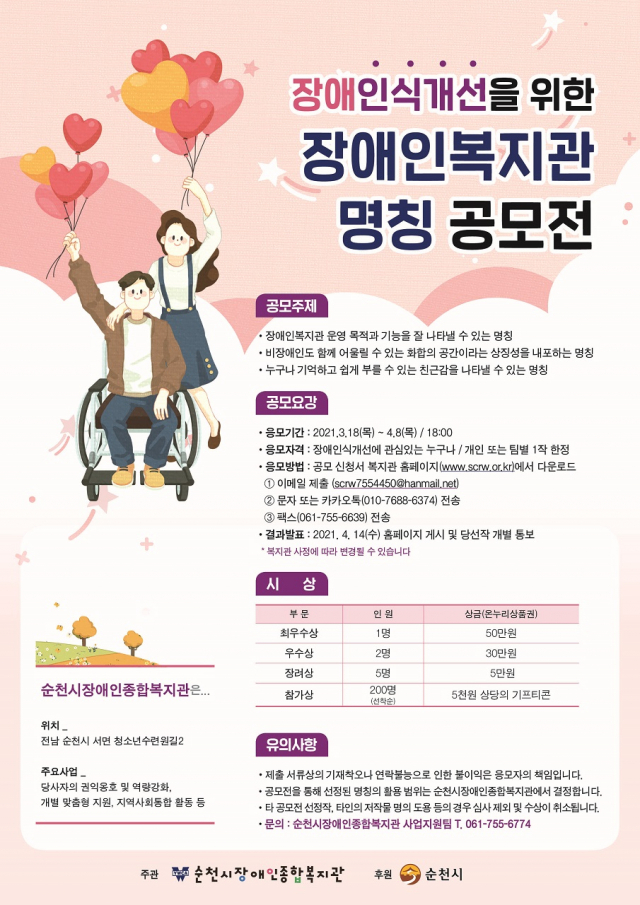 신청접수는 순천시장애인종합복지관 홈페이지에서 신청서를 내려받아 전자우편, 문자 또는 카카오톡, 팩스 등으로 접수하면 된다. 공모결과는 오는 4월 14일 홈페이지를 통해 공개될 예정이다.