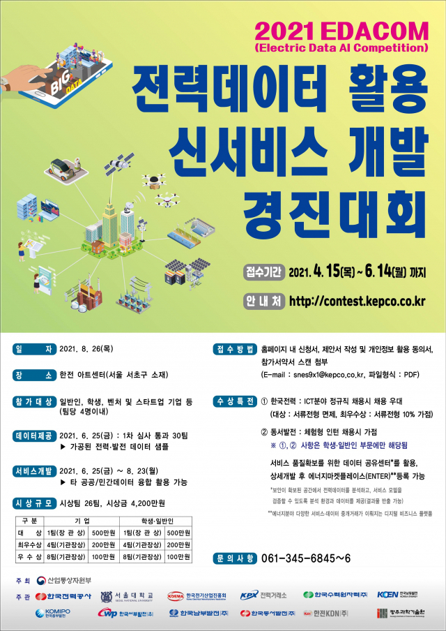 한전KDN(사장 박성철)이 산업통산자원부가 주최하고 한국전력과 전력그룹사, 광주과학기술원 등 에너지 관련 기관들과 함께 공동주관으로 ‘2021년 전력데이터 신서비스 개발 경진대회’를 개최한다.