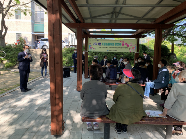 이날 산수1동 산수도서관 옆 정자에서 실시된 골목토크에서는 쓰레기 무단투기 지역 인근에 거주하는 주민들이 참석해 지난해 설치된 재활용 동네마당 현장을 돌아보고 자원순환마을의 완전한 정착을 위한 보완점들을 집중 논의하는 시간을 가졌다.