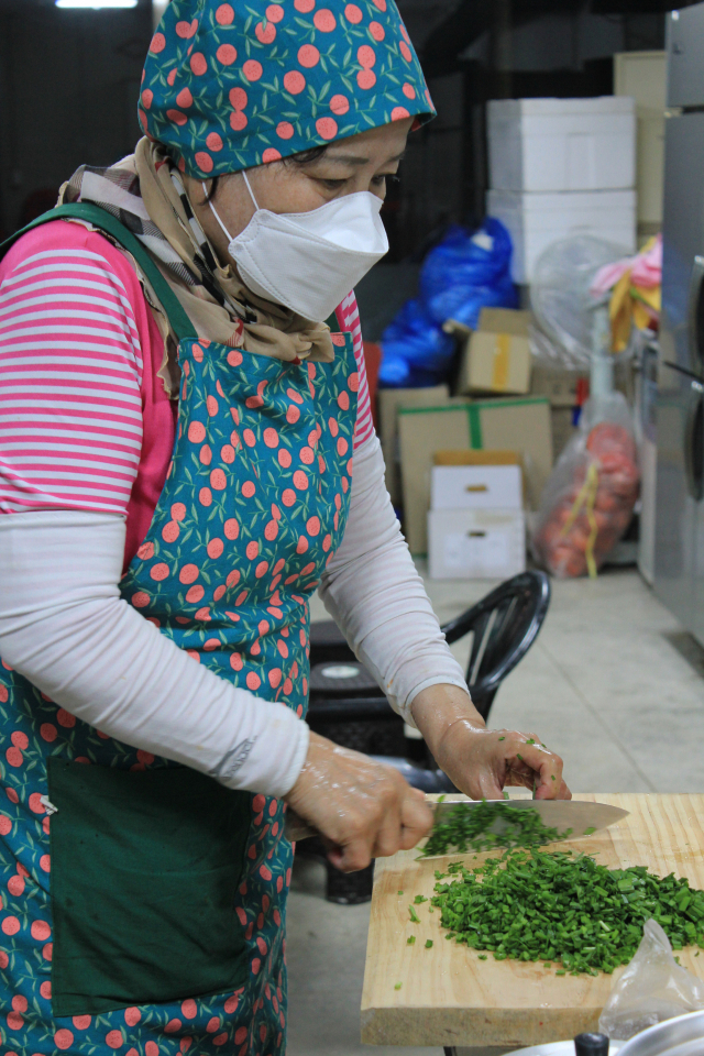 A. 어둠이 가기 전 새벽에 나와서 일반미에 찹쌀을 섞어 만든 밥과 닭볶음, 두부 부침, 계란찜 등을 만들거나 도시락 포장을 하고 있어요.