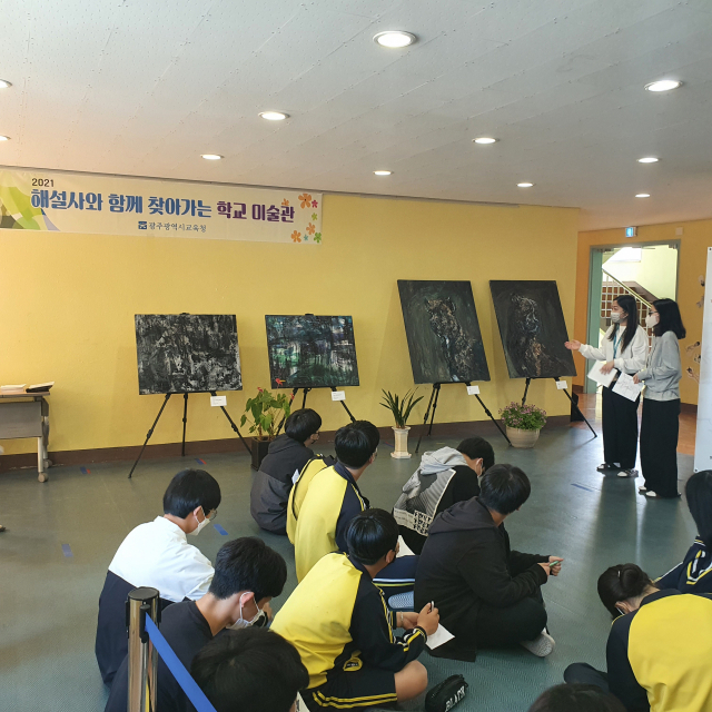 28일 시교육청에 따르면 ‘해설사와 함께 찾아가는 학교 미술관’은 코로나19로 미술관 단체 방문이 어려운 광주 관내 중·고등학교 학생들을 위해 마련됐다. 광주시립미술관 청년예술인지원센터 입주기획팀 ‘장동콜렉티브’가 기획을 맡았다. 전시 참여 작가는 강지수·윤상하·하도훈 등 청년예술인지원센터 입주 작가 8명이다.