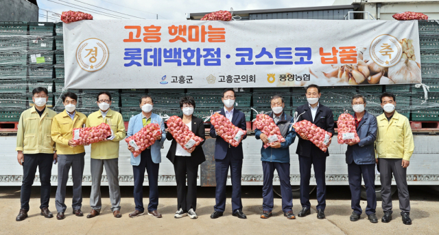 고흥군(군수 송귀근)은 21일 풍양면 한동공판장에서 송귀근 군수를 비롯한 박미화 풍양농협장 등이 참석한 가운데 고흥 햇마늘 대형마트 출하식을 갖고 코로나19로 어려움을 겪고 있는 마늘 재배농가들의 판로 확장에 안간힘을 쏟고 있다고 밝혔다.